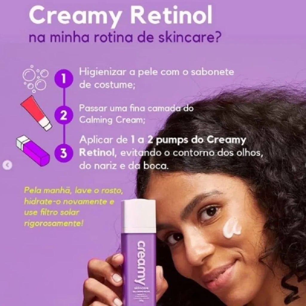 O que é o Creamy Skincare Retinol? Creamy Skincare Retinol é um gel creme facial anti-idade de uso noturno. Sua fórmula contém 0,3% de retinol puro (Vitamina A), nano-vitamina c e Phloretin, com efeito antioxidante. Ele também possui peptídeos que promovem firmeza à pele e traz ainda ingredientes calmantes e reparadores que garantem conforto na aplicação. Além disso, este é um produto vegan-friendly e livre de crueldade animal. Para que serve o gel creme Creamy Skincare Retinol? Ideal para todos os tipos de pele, especialmente as maduras, o gel creme Creamy Skincare Retinol corrige rugas acentuadas, clareia e uniformiza o tom e a textura da pele e promove renovação celular profunda, estimulando a síntese de colágeno e melhorando a aparência da pele. Desenvolvido para prevenir e clarear manchas e rugas causadas pelo sol e pela idade, ele também melhora rugas profundas, reduz poros dilatados e ajuda a controlar o brilho e a oleosidade excessiva. Benefícios e diferenciais do gel creme Creamy Skincare Retinol Creme facial anti-idade de uso noturno. Ideal para todos os tipos de pele, especialmente as maduras. Contém 0,3% de retinol puro (Vitamina A). Corrige rugas acentuadas. Clareia e uniformiza o tom e a textura da pele. Promove renovação celular profunda. Estimula a síntese de colágeno e melhora a aparência da pele. Contém nano-vitamina C e Phloretin, com efeito antioxidante. Previne e clareia manchas e rugas causadas pelo sol e pela idade. Possui peptídeos que promovem firmeza à pele. Traz ainda ingredientes calmantes e reparadores que garantem conforto na aplicação. Melhora rugas profundas. Reduz poros dilatados. Promove firmeza e elasticidade. Renova, esfolia e normaliza a espessura da pele. Controla o brilho e a oleosidade excessiva. Produto vegan-friendly e livre de crueldade animal.